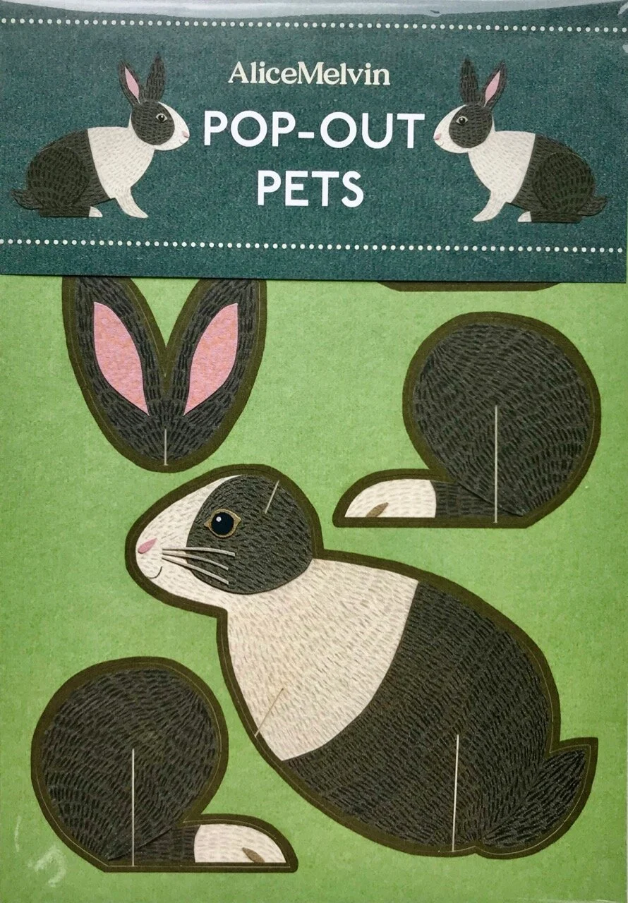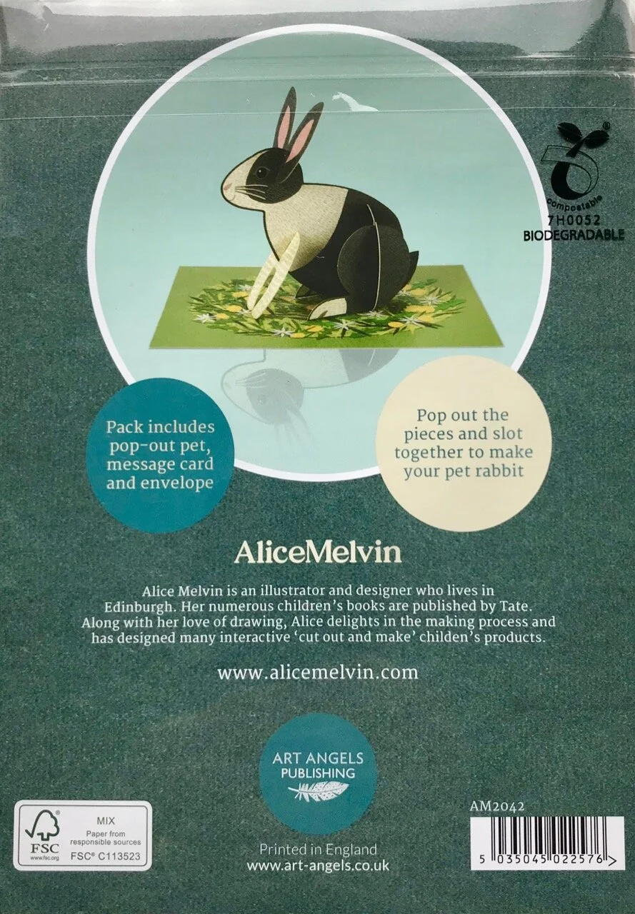 Pop-out (slot together and make up yourself) greetings card / pet rabbit. Designed by Alice Melvin, an illustrator and designer who lives in Edinburgh. Her numerous children’s books are published by Tate. Pack includes pop-out pet, message card and envelope. Card is made from sustainable sources and is FSC approved. Package size - 15 x 21.5cm. Rabbit height - 13 x 11.5cm.